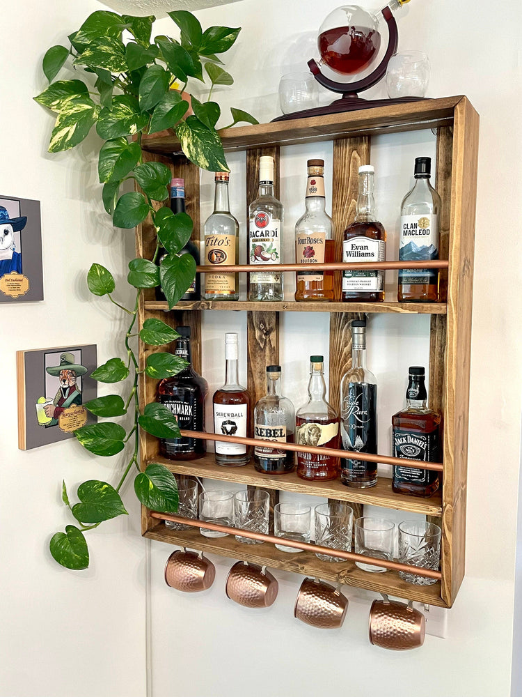 Wall-mounted bar shelves designed to display wine bottles, glassware, and home bar décor. Custom sizing and stain options available.